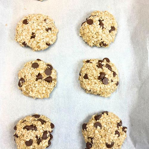 Use cookie scoop to form cookies and place them onto baking tray lined with parchment paper.