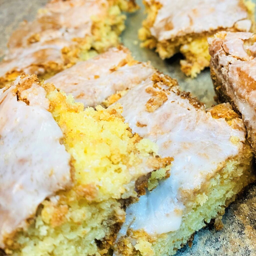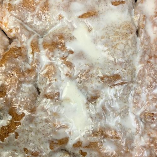 This cake’s flavor is best described as a love child between a honey bun and a cinnamon roll. The texture is soft and crumbly while the crust has a slight crunch and is covered in a glaze. An easy way to impress your friends and family at your next gathering; they won’t believe this cake isn’t store brought.