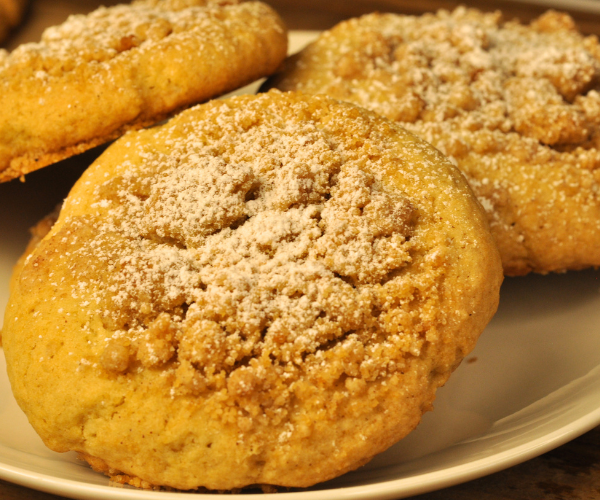 - Line a cookie sheet with a silicone baking mat and form cookies using about 2 tablespoons of dough for each. Place cookies on cookie sheet about 2 inches apart then use the back of a spoon to make indents in the middle of each cookie. This will be where streusel goes.