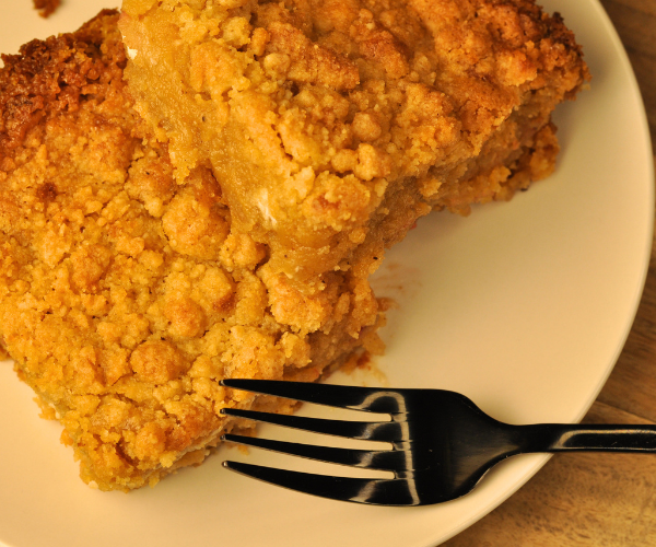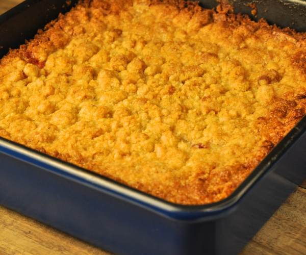 - Transfer the batter into a well greased 8×8 brownie pan then top evenly with streusel making sure edges are covered then bake for 35-40 minutes or until edges are golden brown.