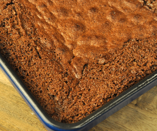 - Pour the batter evenly into a well greased 8×8 brownie pan then bake for 30 minutes.