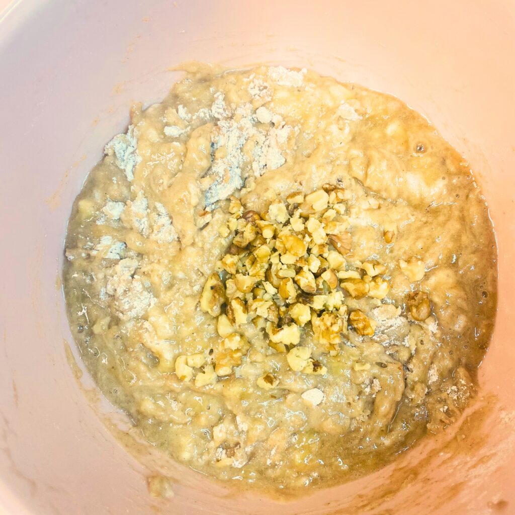 Combine both mixtures and and stir in chopped walnuts, be careful not to overmix batter.