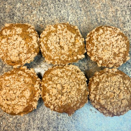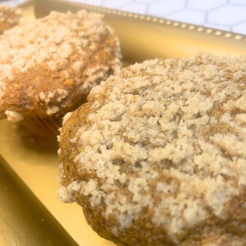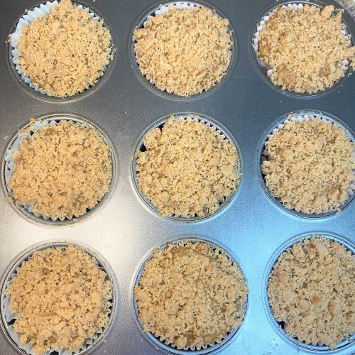 Line muffin tin with cupcake liners and pour in batter; be sure to not fill all the way to the top as muffins will rise slightly. Sprinkle streusel over top, evenly coating the top of each muffin.