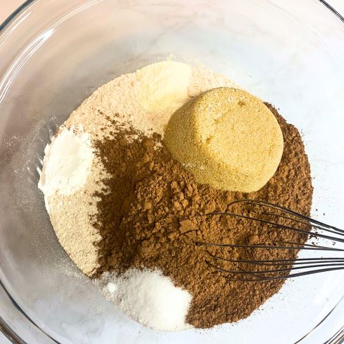Combine whole wheat flour, cocoa powder, milk powder, salt, baking powder, and brown sugar in a mixing bowl.